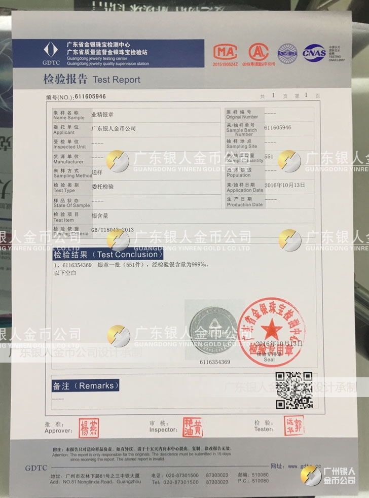 廣東銀人金幣公司承接客戶個(gè)性化定制的金銀幣、金銀章、金銀條、金銀牌、金銀盤(pán)均由國(guó)家質(zhì)監(jiān)部門、嚴(yán)格檢測(cè)、權(quán)威鑒定: